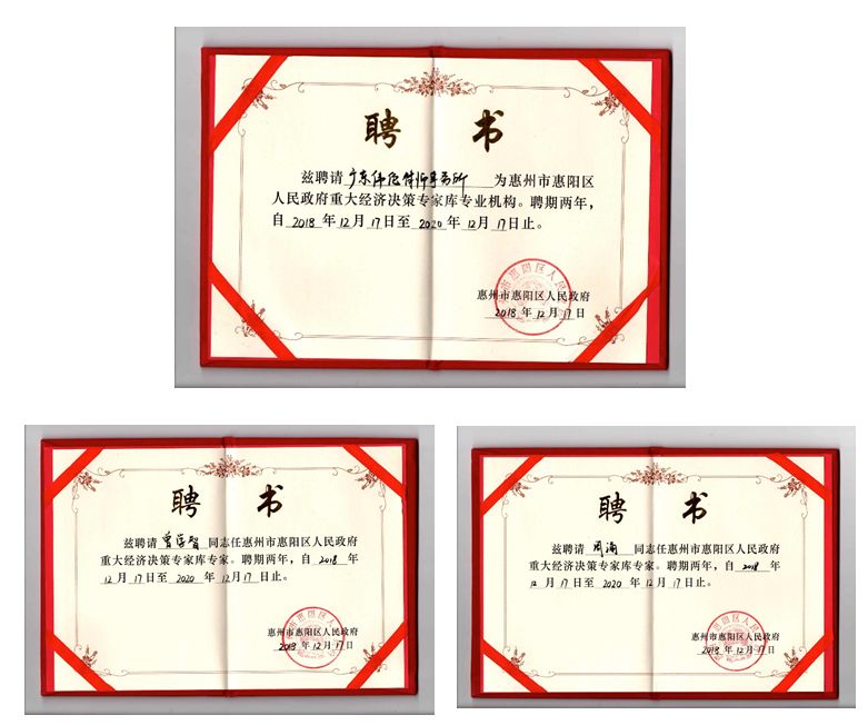 其中广东伟伦律师事务所获聘“惠州市惠阳区人民政府重大经济决策专家库专业机构”;曾学智、周涌两名律师获聘“惠州市惠阳区人民政府重大经济决策专家库专家”