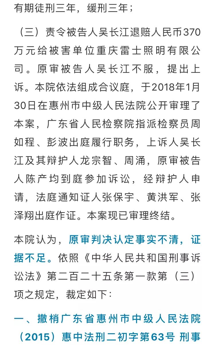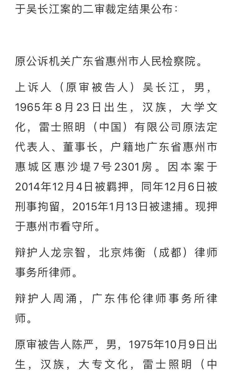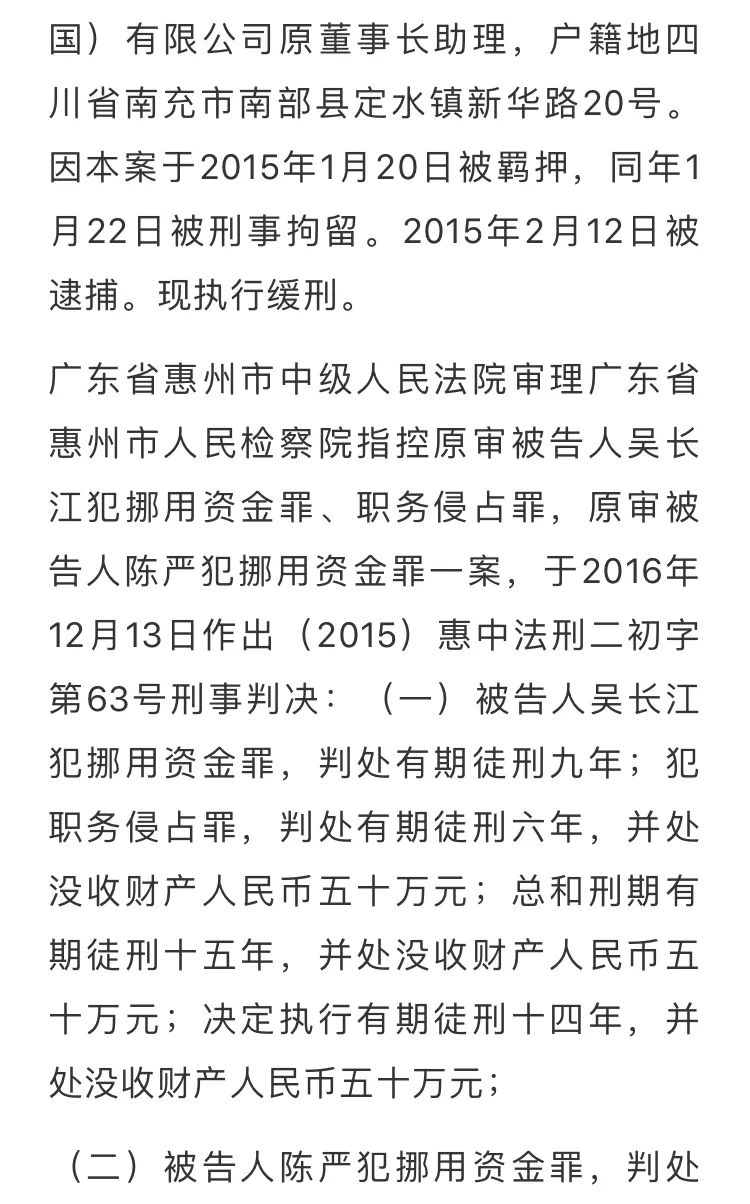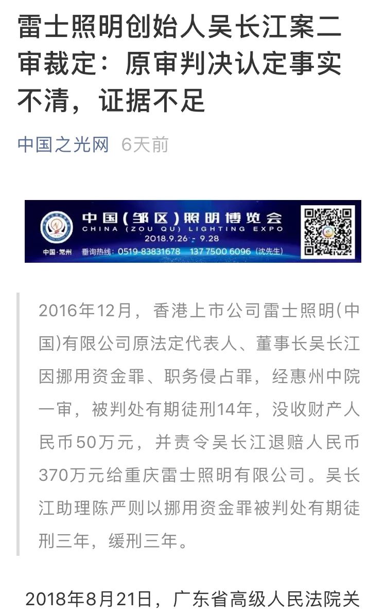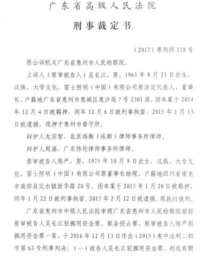 2016年12月,香港上市公司雷士照明(中国)有限公司董事长,“雷士照明”创始人吴长江因挪用资金罪、职务侵占罪,经惠州中院一审,被判处有期徒刑14年,没收财产人民币50万元,并责令吴长江退赔人民币370万元给重庆雷士照明有限公司。吴长江助理陈严则以挪用资金罪被判处有期徒刑三年,缓刑三年。