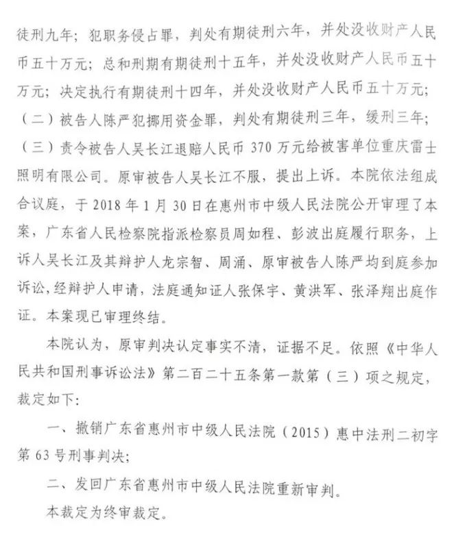 一审判决后,我所周涌律师与著名法学家龙宗智教授在一审担任吴长江辩护人的基础上,继续接受吴长江家属及本人委托,担任其二审阶段辩护人。辩护律师认为一审判决事实不清,证据不足的意见在审判中得到认可,广东省高级人民法院裁定一审判决事实不清、证据不足,撤销吴长江14刑期的一审判决,将案件发回重审。