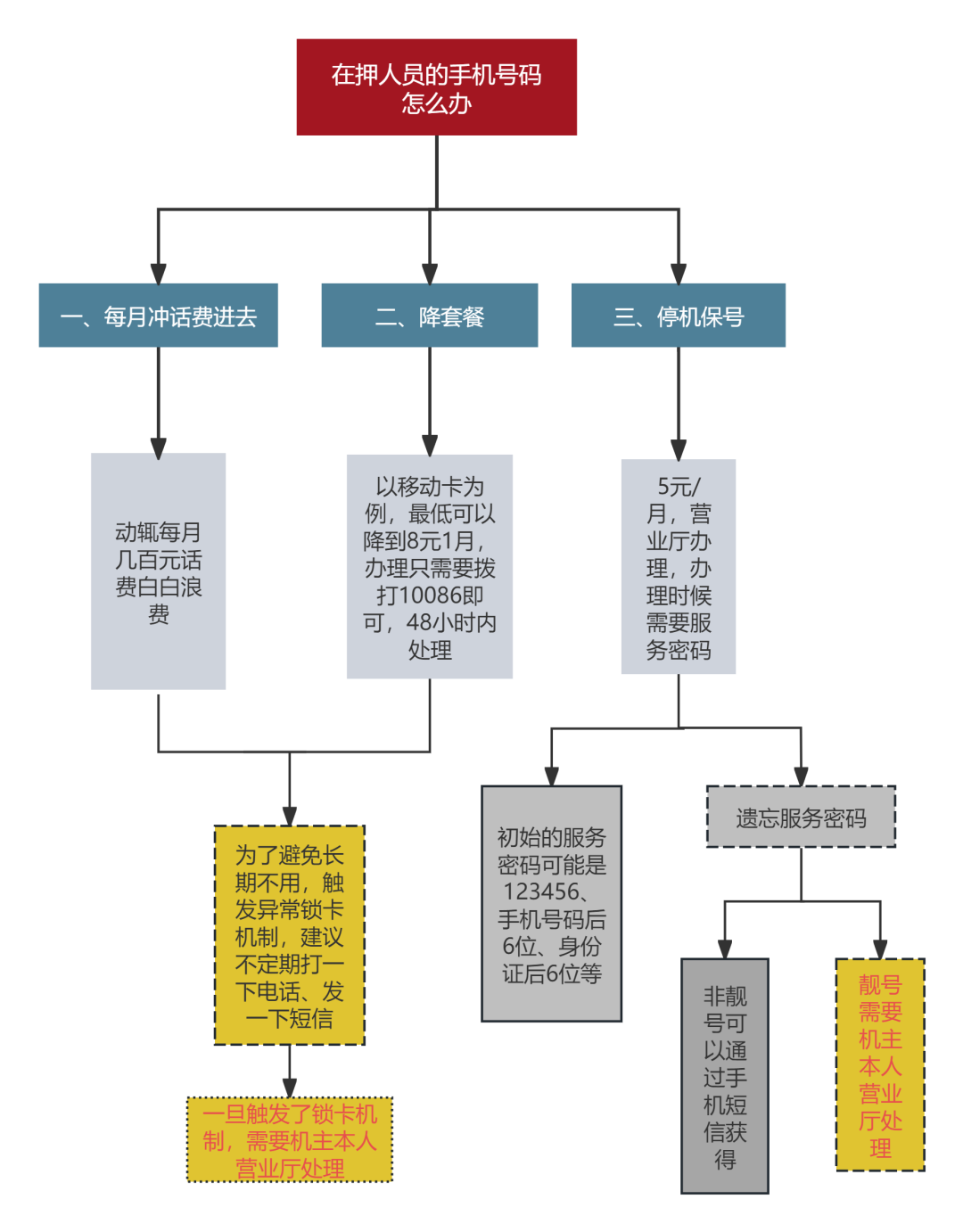 3.若手机号在当事人被释放前无任何作用,则可采取停机保号(5元/月)的方式,到营业厅办理停机保号。需要到营业厅进行办理,办理时需要服务密码(初始的服务密码可能是123456/手机号码后六位/身份证),若以往服务号码,非靓号可以通过手机信号获得,靓号则要通过机主本人到营业厅处理。