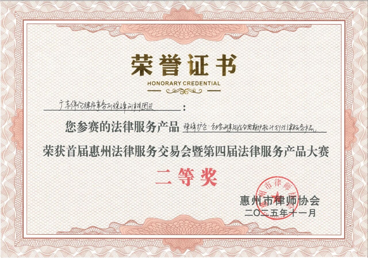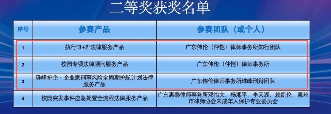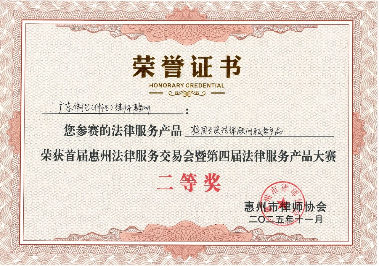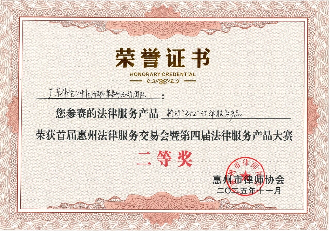 广东伟伦律师事务所携三大创新法律服务产品参赛,凭借深厚的专业积淀、精准的需求定位与高效的解决方案,从众多参赛队伍中脱颖而出,一举斩获多项殊荣。其中,伟伦(仲恺)所的“执行‘3 + 2’法律服务产品”和“校园专项法律顾问服务产品”,伟伦所的“珠峰护企·企业家刑事风险全周期护航计划法律服务产品”均荣获二等奖。