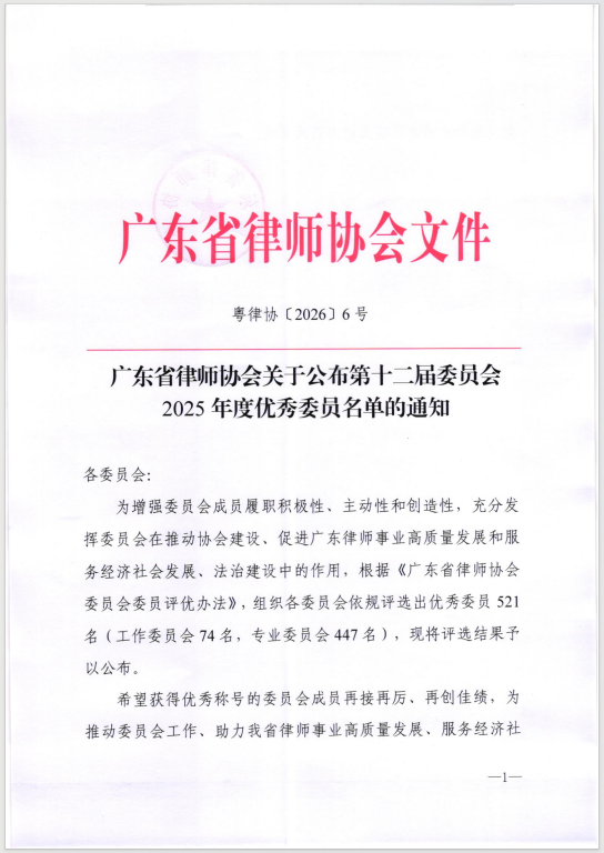 近日,广东省律师协会依据《广东省律师协会委员会委员评优办法》,组织开展第十二届委员会2025年度优秀委员评选,旨在充分发挥各专门委员会职能作用,激发委员履职活力。